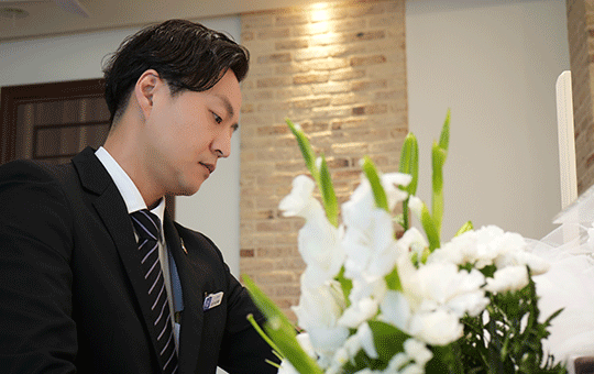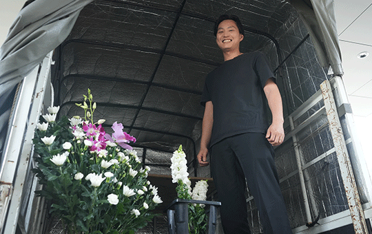 博愛社の花祭壇はカタログのプランに載っている既定のものを作りますが、中には社葬などの大型葬になると、オーダー制のプレミアム祭壇があります。例えばゴルフをモチーフにした祭壇や、故人様の趣味での自動車をモチーフにしたもの、生前野球が好きで、バットをモチーフにしてほしいなどというご依頼を受けて、過去の事例写真などを参考にしながらアレンジを加えてオリジナルのものに仕上げていきます。ただ1日2日かけて、かなり大きなものを作り上げていくので大変です。大きい祭壇でもほぼ一人で祭壇を作ります。特に縁取りは基本一人で行います。終わりがけで、あと色花だけを挿すというときはお手伝いできますが、やはりその方の個性もあるし、手出しできない部分もあるので祭壇の肝になるところはその担当に任せます。こういう所で、職人気質が色濃く出てきますね。作品を作っているんだって思います。そして葬儀の後に丹精込めて作り上げた大作が一日で破壊される、それがかなり気持ちいいんです。最初はそれがショックでしたが、いつからか、次の日に仕事を引きずらないという気持ちの切り替えスイッチにもなっていきました。今までのアパレル仕事は半年単位で仕事が進んでいったのですが、この仕事では通夜・告別式の2日で作ったものが消える、後腐れないかっこいい仕事です。またこの仕事のやりがいは、言うまでもなく花祭壇を作り終えた時の達成感です。うまく作り終えることができた際は、やはり気分がいいです。また葬祭事業を通じて寄せられるお客様の「綺麗だった。」というお褒めの言葉も力になります。